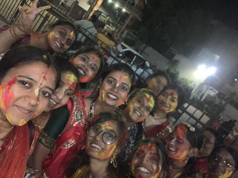 We thank our temple management for helping us by providing us with a sound system and delicious prasadam. It is said that the spiritual programme is incomplete without prasadam, so when we reached the Shri Ekvira Devi temple we all honoured prasadam and distributed it among the people assembled there. Then we had a surprise for everyone. After honouring prasadam, all the Vaishnavis played holi with dry colours, something nobody knew was going to happen.