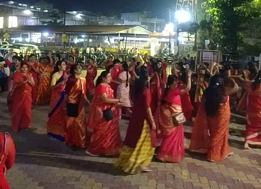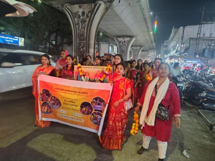 The padayatra took place on International Women’s Day to endow women in spirituality. Our motto is we Vaishnavis cannot walk in padayatra (cannot join any padayatra), so to understand what a padayatra is, to get bliss and the experience of padayatra, to distribute books, prasad and the holy name to the public and remind the culture of padayatra, we organise a Vaishnavi padayatra. As we walk and dance the Vaishnavis also chant the Hare Krishna maha mantra while playing instruments and doing services like book distribution. This year’s dress code was red saree, and it looked very beautiful as matajis moved in a circle producing a visually powerful ring of red fire!