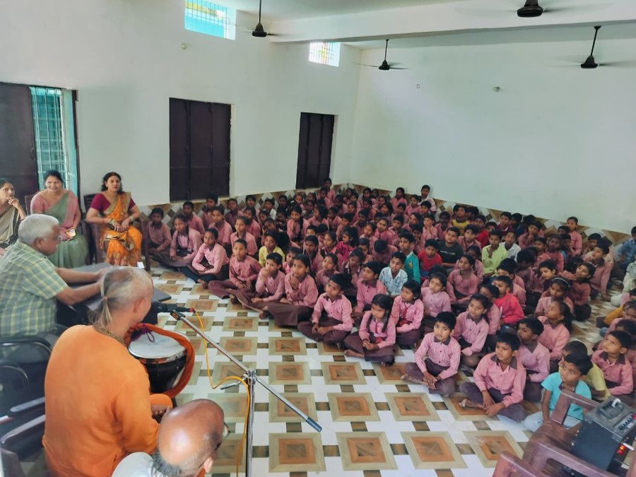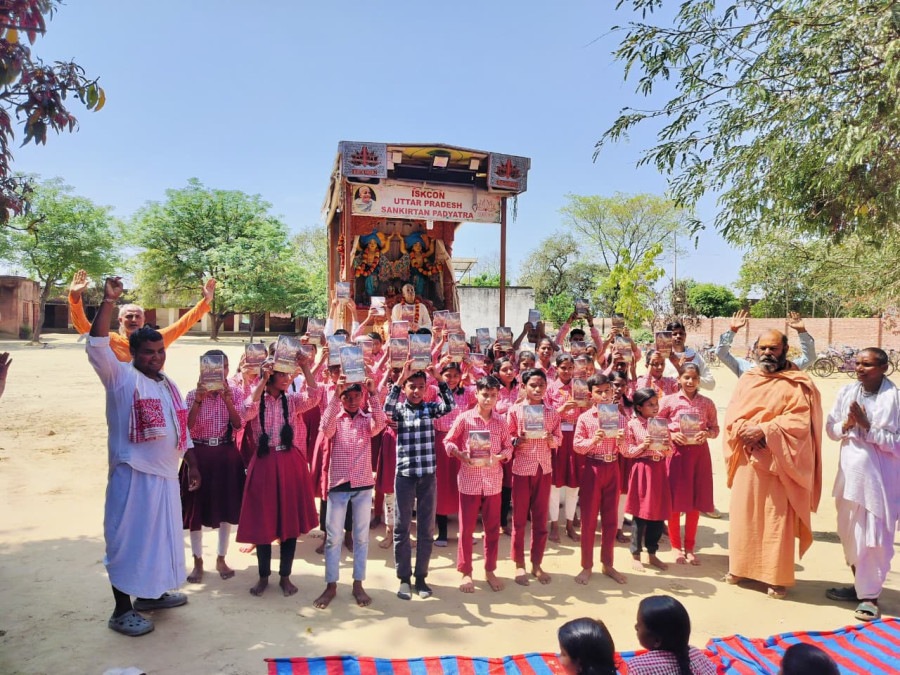 The pupils were very happy to have darshan of Sri Sri Nitai-Gaurasundar, and they and their teachers were captivated by the huge horns of our majestic oxen. It was interesting to discuss the Bhagavad-gita with these little souls. We encouraged them to chant the holy name, and they all joined the sankirtan and danced with us. The students were then asked to write the Hare Krishna maha mantra in their schoolbooks, which they did happily. The padayatris told them stories of Prahlad Maharaja, Dhruva Maharaja and Lord Krishna. I explained to them how they can worship the Lord by chanting the maha mantra and studying nicely, that chanting will increase their concentration and help them in their studies. We also held a quiz on the Bhagavad-gita and the winners were gifted a copy.