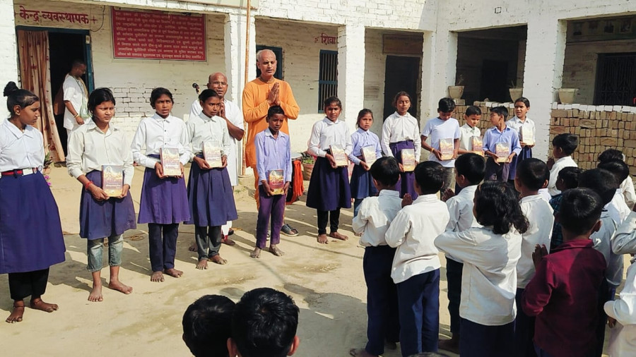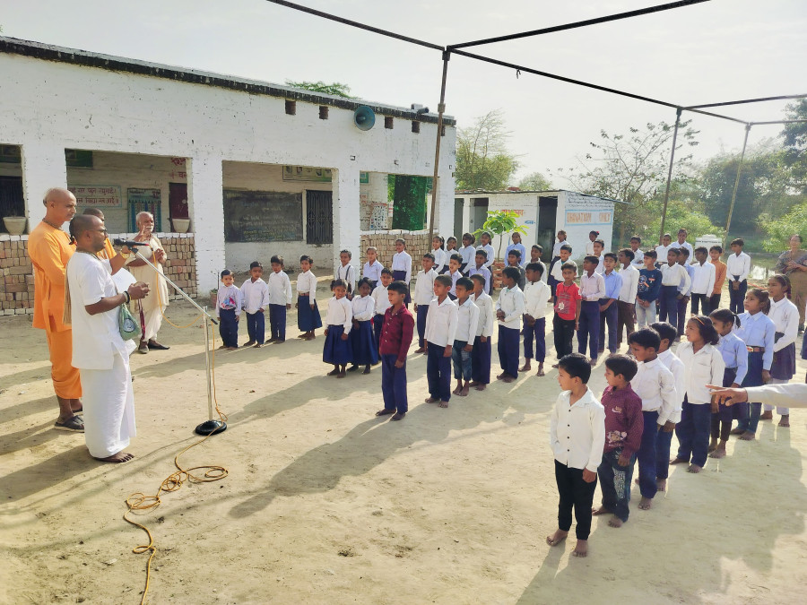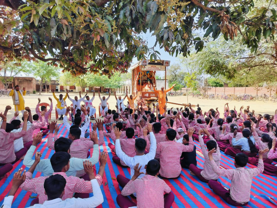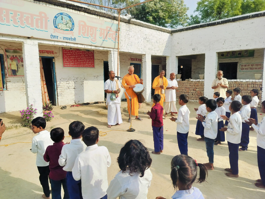 There are many schools within a 10km radius of Raebareli, and we obtained permission to hold a programme at one named Saraswati Shishu Mandir in Aihar village. Two schools nearby liked our sankirtan and people there suggested we do a programme at the mandir.